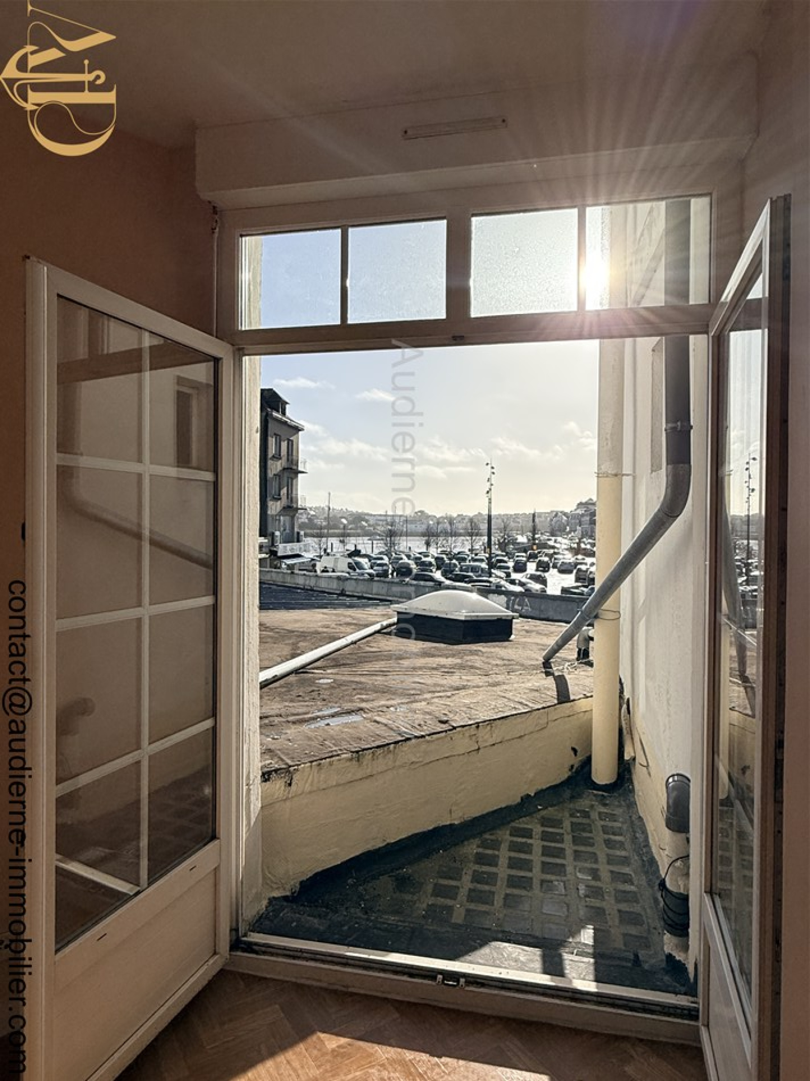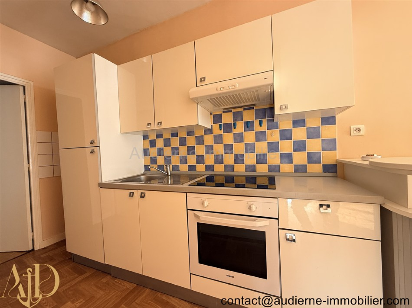 L'appartement comprend : Une pièce de vie avec une porte fenêtre donnant sur un tout petit extérieur avec une vue sur le port d'AUDIERNE. Cette pièce est ouverte sur une cuisine aménagée en couloir, puis vers une salle de bain carrelée, un wc indépendant et une chambre au Nord (au calme).