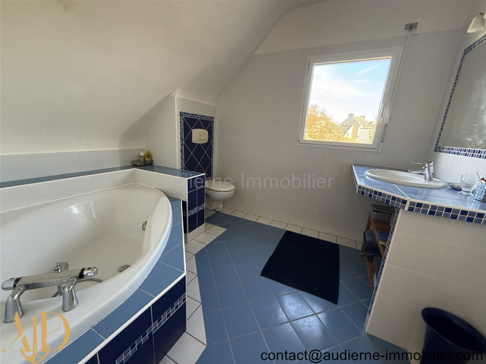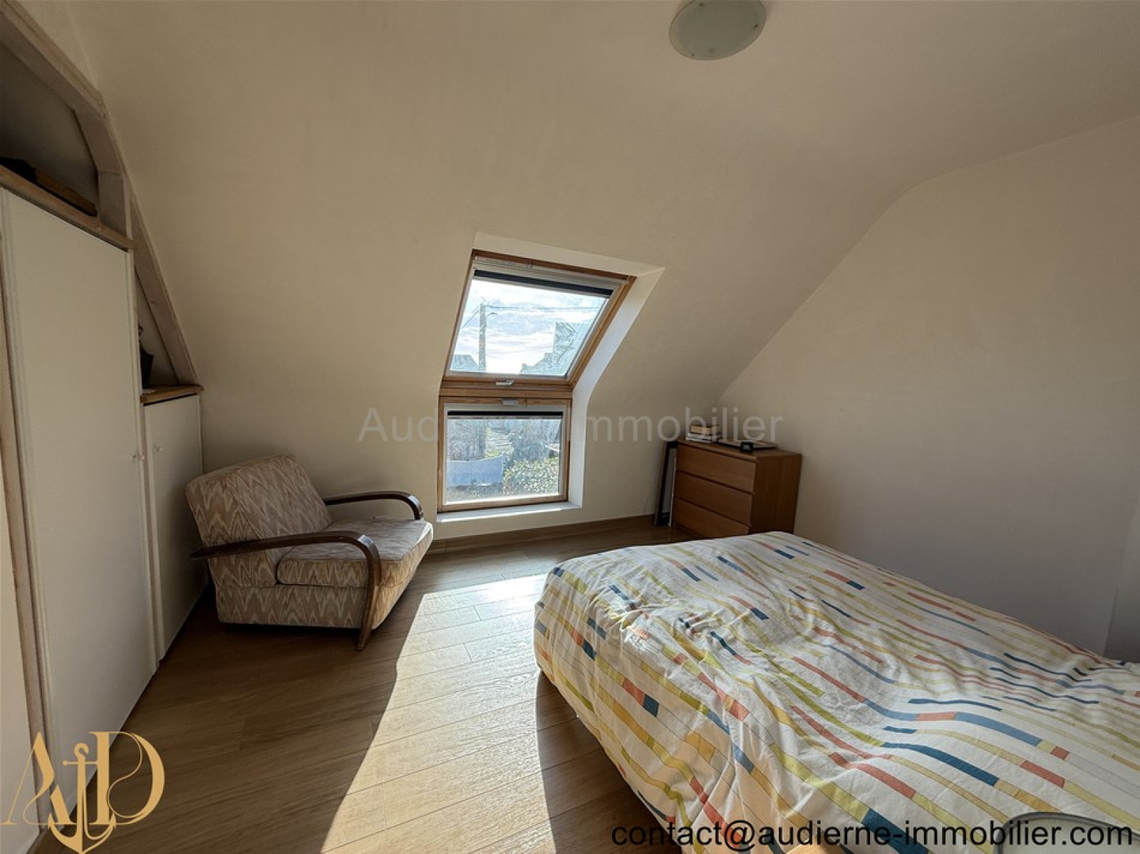 Au 1er étage : Palier ouvert, première chambre avec velux présentant une jolie vue mer (10 m²), chambre avec penderie (10 m²), salle de bain avec baignoire d'angle et wc.