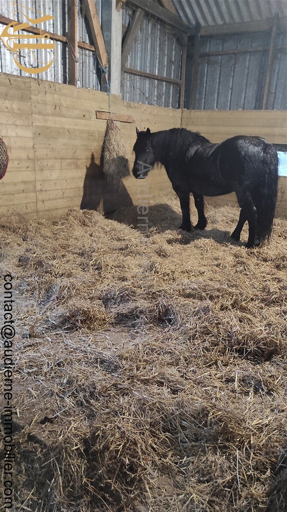 Côté dépendances, la propriété dispose d’une ancienne crèche/grange, de soues à cochons aménagées et d’un grand hangar fermé de plus de 200 m² offrant des volumes généreux et rares pour les passionnés d’équitation : box, sellerie, espace de stockage pour le fourrage et le matériel, ou encore abris adaptés aux chevaux. Les terrains attenants sont parfaitement aménagé (clos de haies et cloturés) en prairies et paddocks.