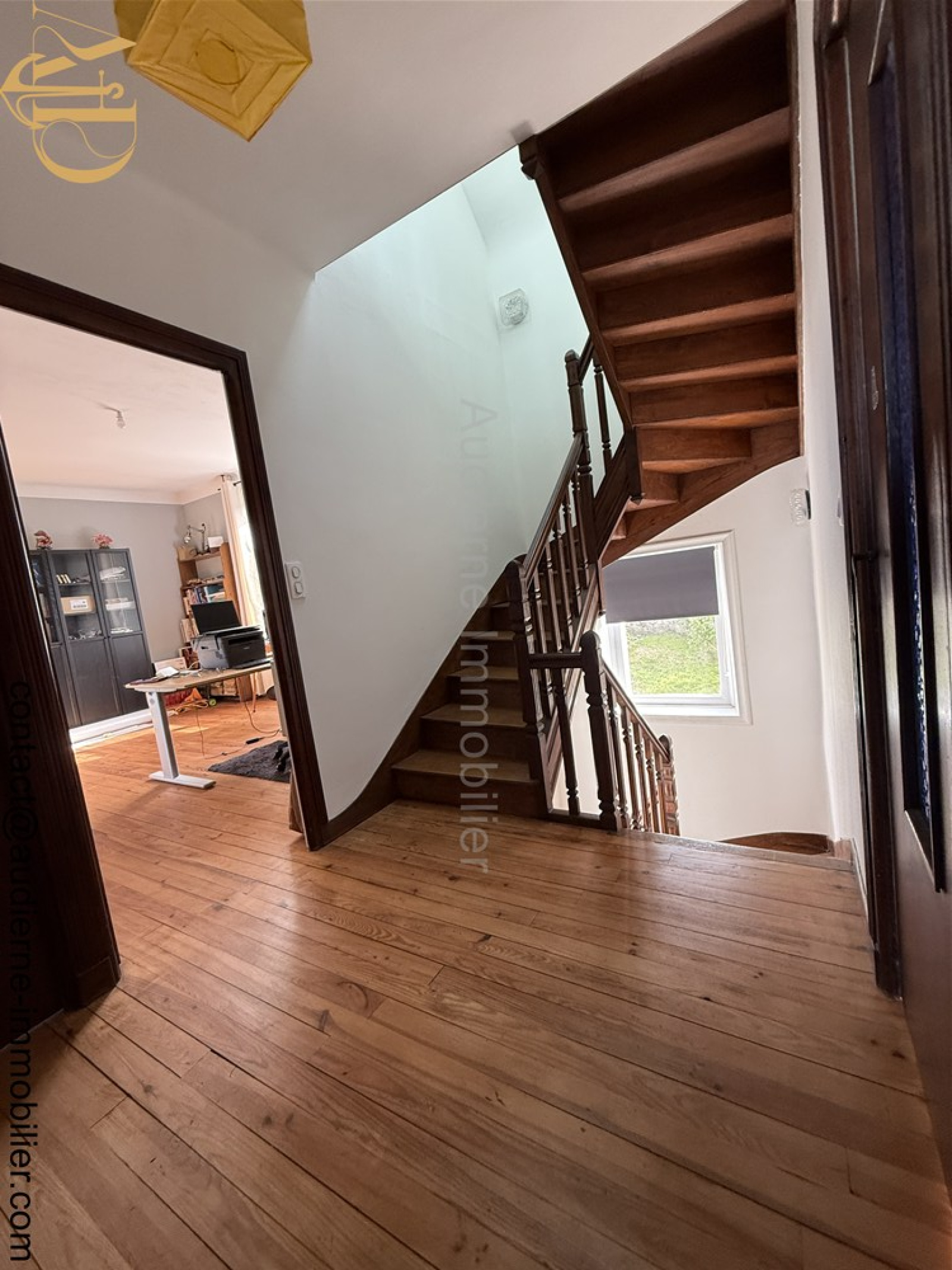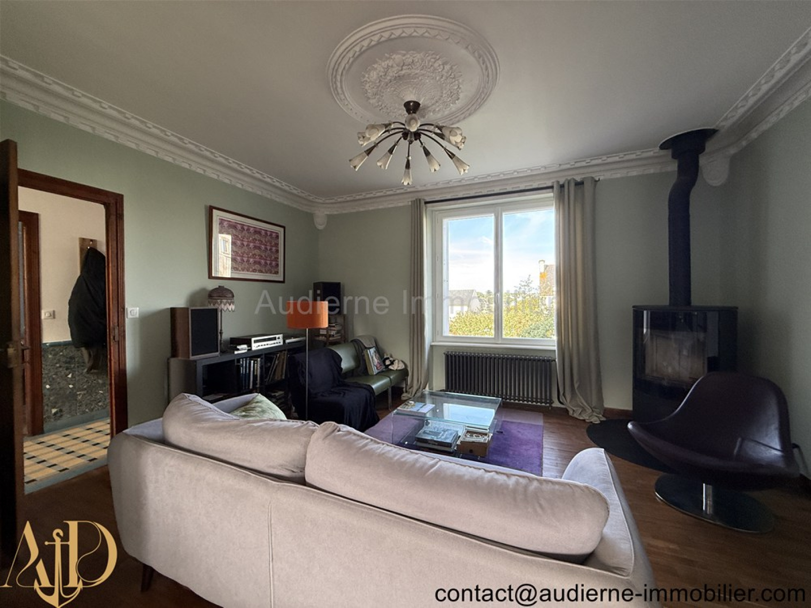 La maison comprend en rez-de jardin : un grand espace buanderie, chaufferie, atelier. Au 1er étage : entrée, séjour avec poêle à bois ouvert sur une cuisine aménagée et équipée avec ilôt central, salle à manger, chambre sur parquet bois, WC avec lave mains. Au 2ème étage : palier, 3 chambres dont une avec un espace bureau/dressing sur parquet bois, une salle d'eau avec wc. Au 3ème étage : palier, deux chambres, une salle d'eau avec wc et deux greniers. Grand garage de 35 m² avec un appartement T2 (une chambre indépendante) au dessus entièrement refait à neuf.