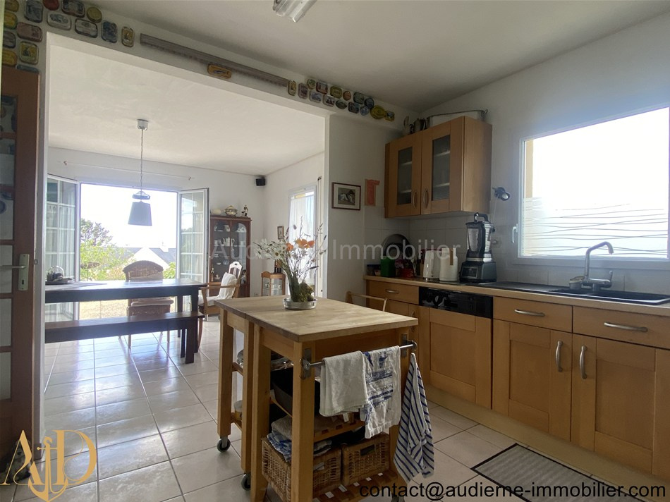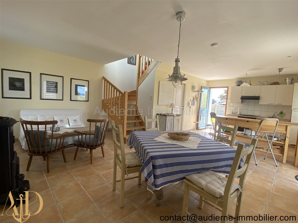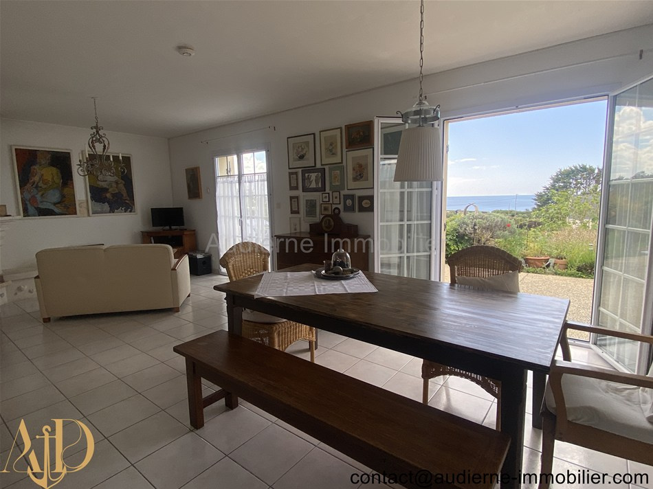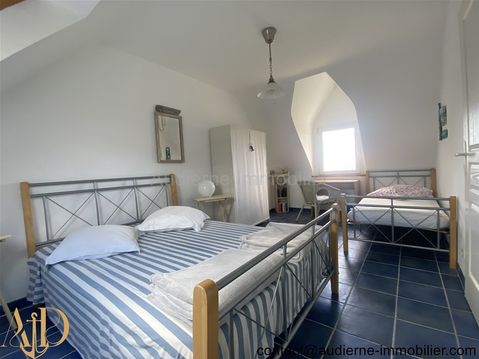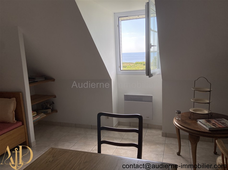 Elle comprend au rez-de-chaussée : Entrée (6,5 m²) avec grand placard (1,2 m²) et escalier, salon / séjour avec une cheminée insert et deux portes fenêtres (30,4 m²) -> vue magnifique sur mer, cuisine aménagée et équipée (10,9 m²), chambre (16,5 m²) avec un accès vers une salle d'eau centrale partagée, chambre (9,15 m²) avec un accès vers une salle d'eau centrale partagée, salle d'eau centrale entièrement carrelée (3,53 m²), WC + lave main (1,2 m²). A l'étage : Palier aménagé en coin kitchinette (6,5 m²), deux chambres carrelées (10,4 et 9,8 m²), salle de bain (4,6 m²), WC + lave main (0,6 m²), une pièce séjour mansardée et entierement carrelée (18,8 m²), chambre en enfilade au dessus du garage (10 m²)